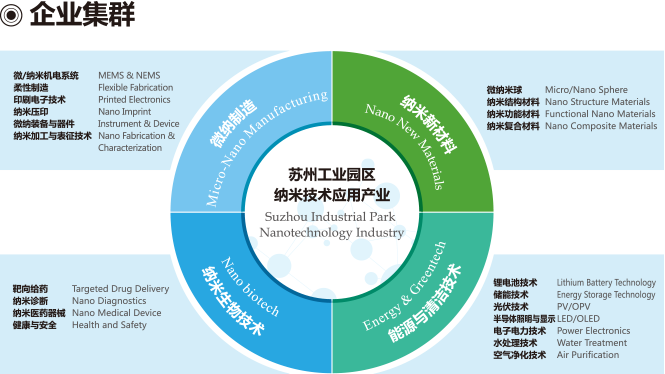 拥有微纳制造、纳米能源与环保、纳米材料、纳米生物医药四大领域,包括MEMS、PE、碳纳米材料、注激光器、GaN、功能膜材料、锂电池等在内的二十个子领域,纳米技术相关企业200余家。