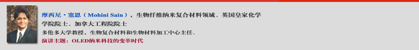 摩西尼•塞恩(Mohini Sain),国际著名生物纤维纳米复合材料专家、英国皇家化学学院院士、加拿大工程院院士、多伦多大学生物复合材料和生物材料加工中心主任、多伦多大学应用化学和化学工程专业及环境科学学院教授。在过去六年中,他的27项研究成果得到转化。本届大会期间,他的演讲主题为“OLED纳米科技的变革时代”。